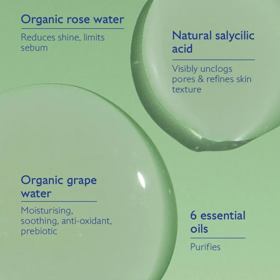 Formlen er også beriget med økologisk rosenvand, som modvirker en overproduktion af talg og fremmer hudens udstråling. Kan anvendes morgen og aften. 99% ingredienser af naturlig oprindelse.