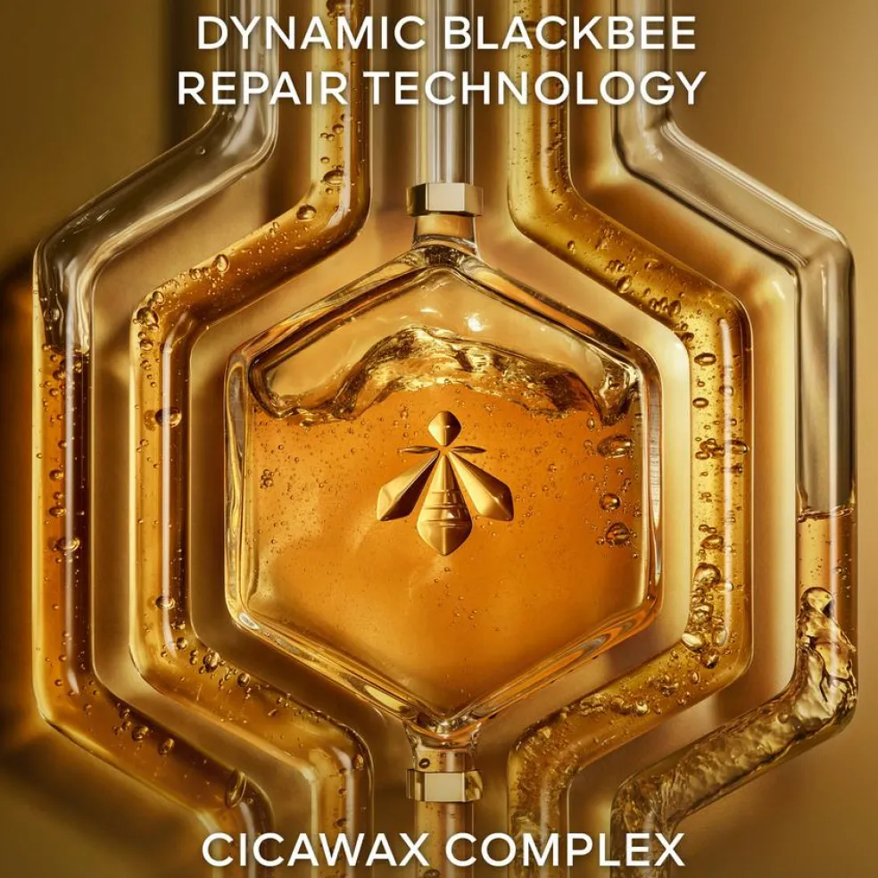 Den lette formel kombinerer Dynamic Blackbee Repair-teknologi, koncentreret Black Bee-honning fra Ouessant Island** med et kraftfuldt kompleks sammensat af beroligende og styrkende aktive ingredienser: Cicawax.