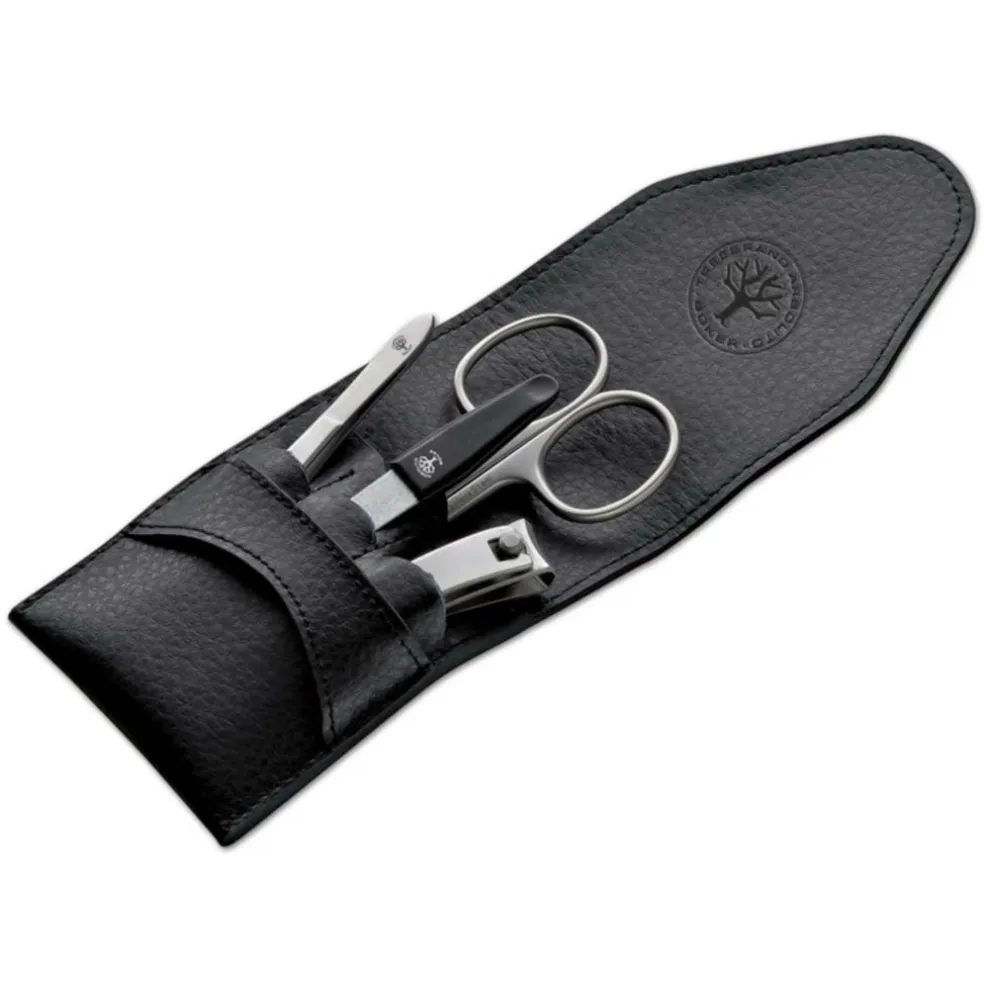 Lækkert manicuresæt til mænd med de mest nødvendige dele. Tyske kvalitetsprodukter fra Solingen, produceret af rustfrit stål og med en ædel og mat overfladefinish. Indeholder 4 dele, hhv. neglesaks, pincet, neglefil og negleklipper. Elegant lille etui af førsteklasses okselæder.