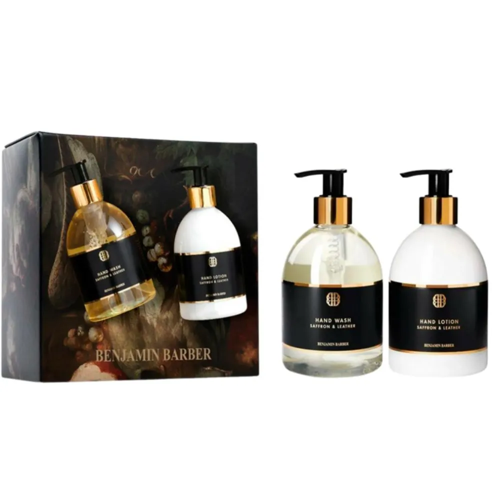 Et gavesæt med Benjamin Barber Saffron & Leather håndsæbe og lotion til rene, bløde og velduftende hænder. Specifikationer