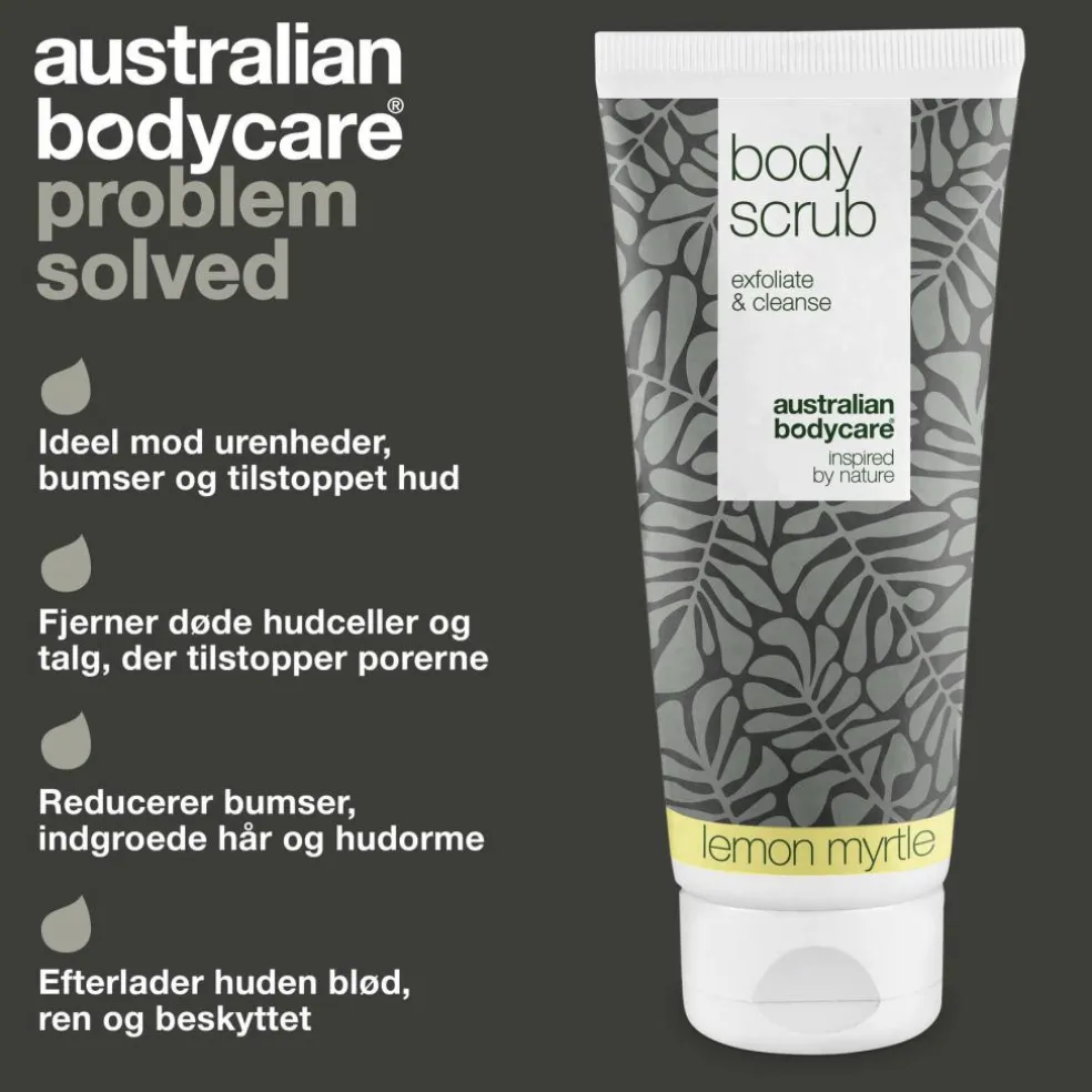 Scrub bruges 1-2 gange om ugen i forbindelse med bad. Efter vask af huden på kroppen påføres Body Scrub den våde hud i cirkulære bevægelser. Vær særlig grundig med at massere produktet godt ind, hvor der er bumser, hudorme og uren hud, fx på ryggen og ballerne. Skyl herefter overskydende produkt og skrubbekorn af huden. Efter dit bad og når du har duppet dig tør, er det vigtigt, at du smører dig med en god creme for at tilføre fugt til huden. Vi anbefaler Australian Bodycare Body Lotion. Inden brugen af scrub kan du med fordel vaske huden ren med Body Wash fra Australian Bodycare.