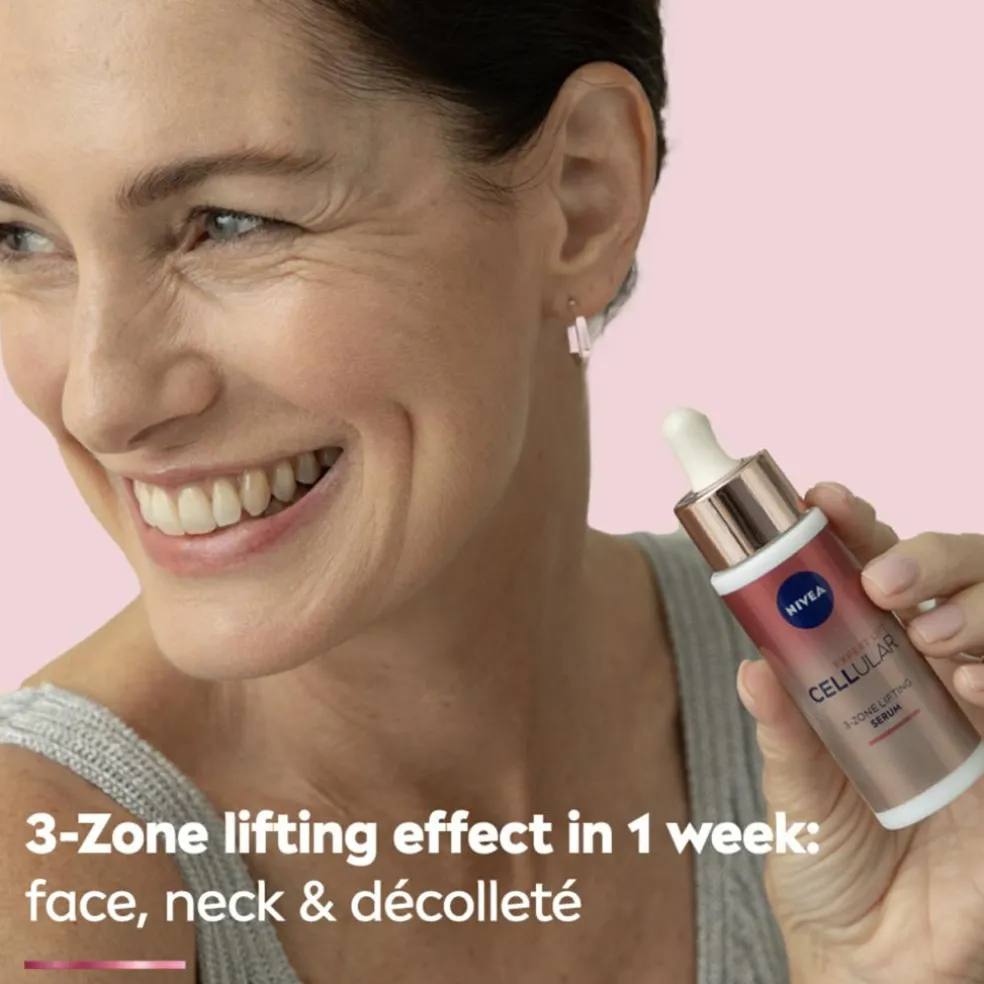 Serummet er en effektiv løsning, der arbejder dybt på celleniveau for en 3-zoners løftende effekt på ansigt, hals og dekolletage.
