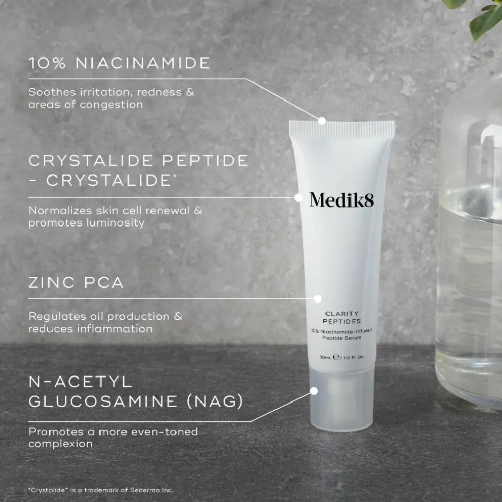 Hurtigt absorberende peptidserum med 10% niacinamid til alle, der ønsker at opnå krystalklar hud! Medik8 har designet et unikt leveringssystem for at sikre, at peptiderne effektivt når derhen, hvor der er mest brug for dem.