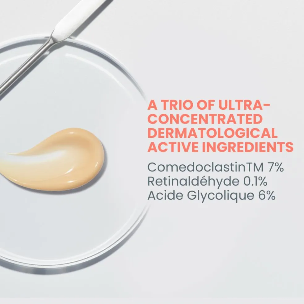 Produktet retter sig mod alle synlige urenheder med en unik og effektiv formel takket være en kombination af dermatologiske aktive ingredienser. 6% glykolsyre (AHA) eksfolierer huden og stimulerer cellefornyelsen. Samtidig vil en patenteret kombination af Comedoclastin™ og 0,1% retinal aktivt hjælpe med at få bumser til at gå væk hurtigere og mindsker mærker efter bumser.