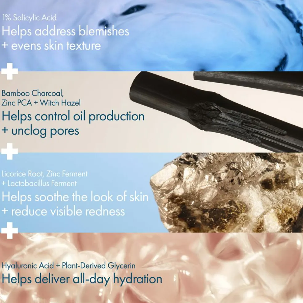 - Nøgleingredienser: Salicylsyre, bambuskul, zink, hamamelis, hyaluronsyre, plantebaseret glycerin, lakridsrod, zink- og lactobacillusfermenter.