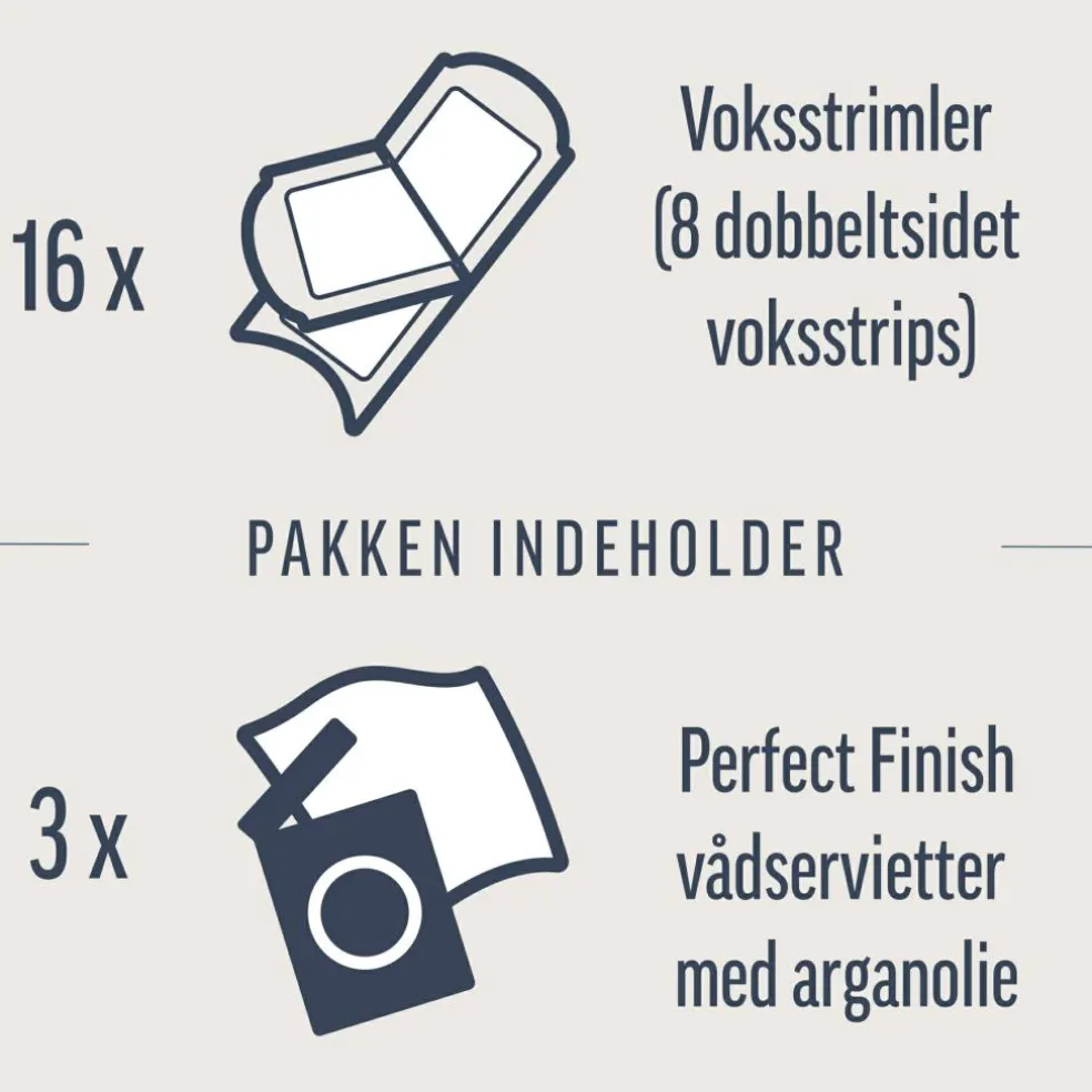 Pakken indeholder 16 voksstrimler og 3 Perfect Finish servietter.