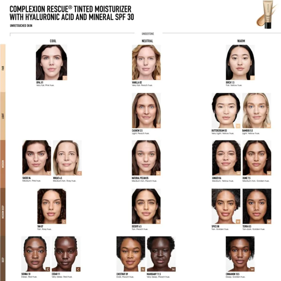 Complexion Rescue Tinted Hydrating Gel Cream er beriget med fugtighedsgivende marineingredienser og mineralelektrolytter, samt øger fugtniveauet i huden med 215% efter en uge og med 287% efter fire uger. Derudover oplevede 100% en forbedret hudstruktur efter kun en uge. *