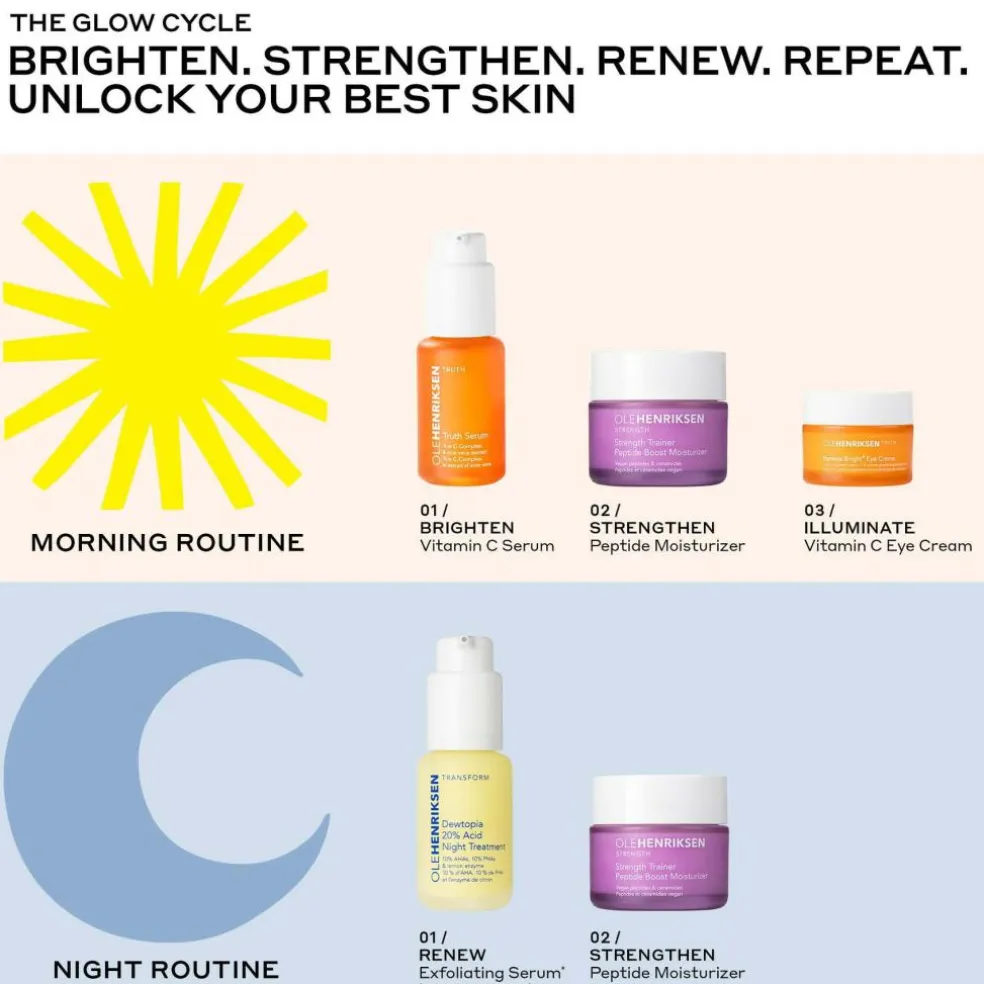 Sig godnat til ujævn hudtone, mørke misfarvninger, fine linjer og rynker, og sig godmorgen til en fantastisk Ole Glow.