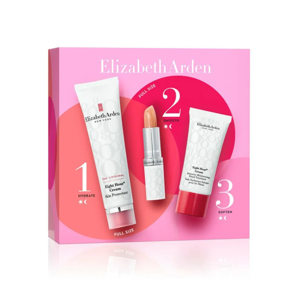 Sættet indeholder også Eight Hour® Cream Lip Protectant Stick SPF 15 for øjeblikkelig beskyttelse og fugt til tørre, sprukne læber samt Eight Hour® Cream Intensive Moisturizing Hand Treatment – en hurtigt absorberende, ikke-fedtet formel, der modvirker tørhed og blødgør huden i op til 8 timer.