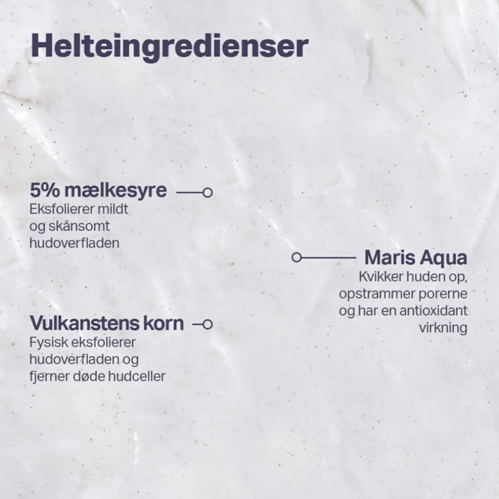 Med en kombination af 5% mælkesyre (AHA) og fysiske skrubbekorn fjernes døde hudceller og synlige porer mindskes. ¨