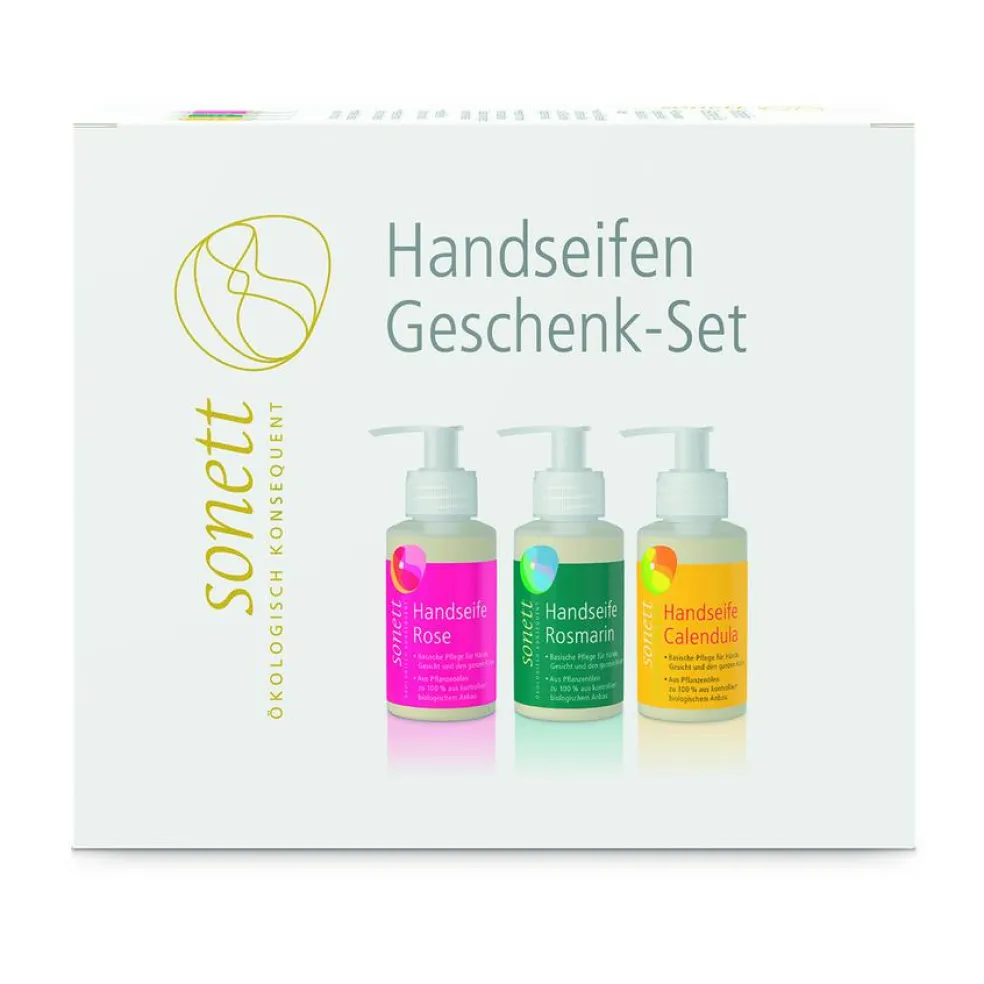 Foruden at være dekorative og praktiske er Sonetts håndsæber også effektive. Nyd de forskellige dufte med enten lavendel, morgenfrue, rosmarin, rose, citron og 7-urter. Der findes også en neutral håndsæbe. Håndsæberne kan bruges både til hænder, krop og ansigt. De udtørrer desuden ikke hænderne. Derudover findes en frisk desinfektion, som også er god til at tage med på farten. Sonett bruger udelukkende 100% økologiske eller biodynamiske olier og æteriske olier. Håndsæbe gavesæt m. 3 sæber á 110 ml Lækkert gavesæt fra Sonett. Indeholder håndsæbe rose, håndsæbe rosmarin og håndsæbe morgenfrue á 110 ml. Vælg mellem duft, alt efter dit humør. Velegnet til hænder, ansigt og resten af kroppen. Håndsæbe rose – 110 ml: Ingredienser: Aqua, potassium olivate*, potassium cocoate*, alkylpolyglucoside, alcohol, glycerin*, citrate, rosa damascena extract*, fragrance (perfume)*: Cymbopogon martinii oil* (contains geraniol*); Pelargonium graveoleus oil* (contains geraniol*, citronellol*), Lavandula hybrida oil* (contains linalool*), Cymbopogon flexuosus oil* (contains citral*), balsamum dipterocarpi. *Økologisk dyrket.