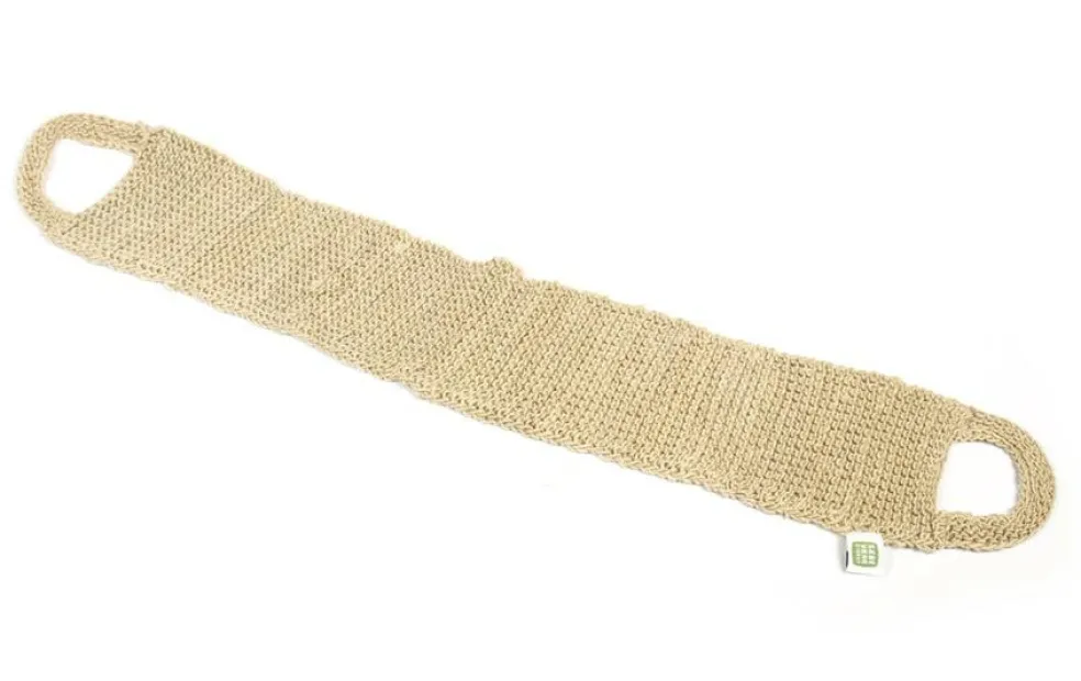 Hampstroppen er ideel til at skrubbe de døde hudceller bort og stimulere blodcirkulationen, også på ryggen, hvor det ellers kan være svært at nå. Stroppen kan anvendes såvel tør som våd. Vore håndstrikkede hampprodukter har vi hentet fra Bangladesh. Vi handler med en organisation, der skaber job til kvinder, til en rimelig løn. Projektet er i efteråret 2016 blevet Fairtrade certificeret. Hampprodukterne er alle af høj kvalitet, både hvad angår udførelse og materiale. Hamp dyrkes i stor stil i Bangladesh, og det er velegnet til denne slags produkter. Materialet er stærkt og giver et godt skrub uden at ridse eller skade huden. Hamp er et rigtig godt materiale at bruge til svampe, som man tager med sig i badet. Materialet er stærkt og giver et godt skrub uden at ridse eller skade huden. Dimensioner: ca. 51 x 10 cm.