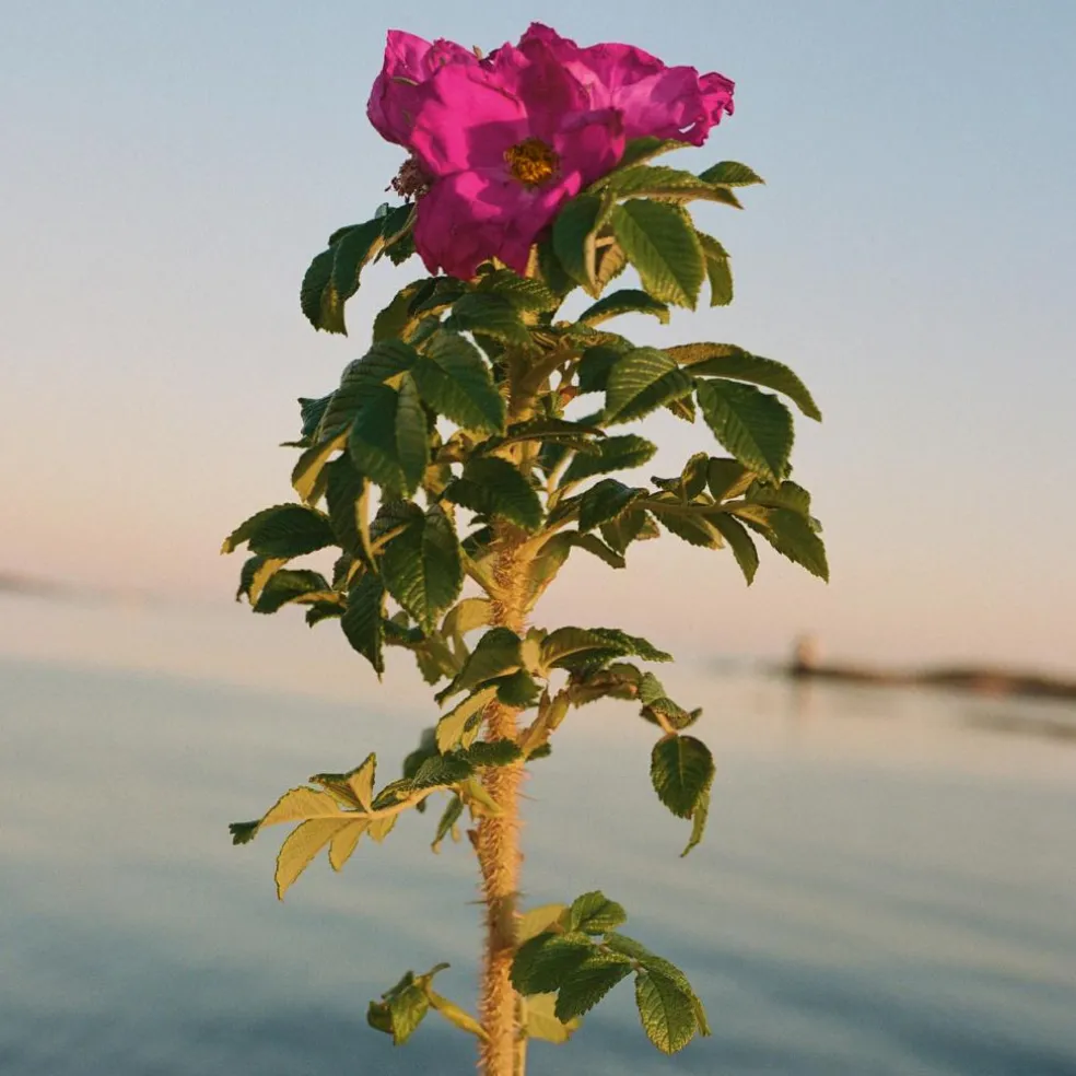 Transporterer dig til Sveriges vilde kyster om sommeren, hvor duften af blomstrende strandroser blander sig med havdis, båret af vinden.