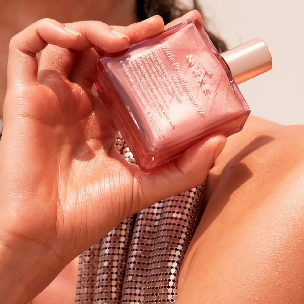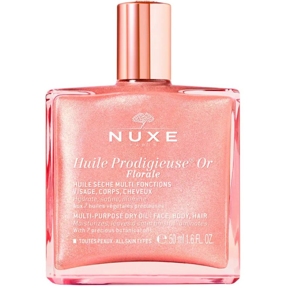Plejer, efterlader en satinfinish og forskønner huden med en naturlig lysende effekt takket være de rosa guldglitter.