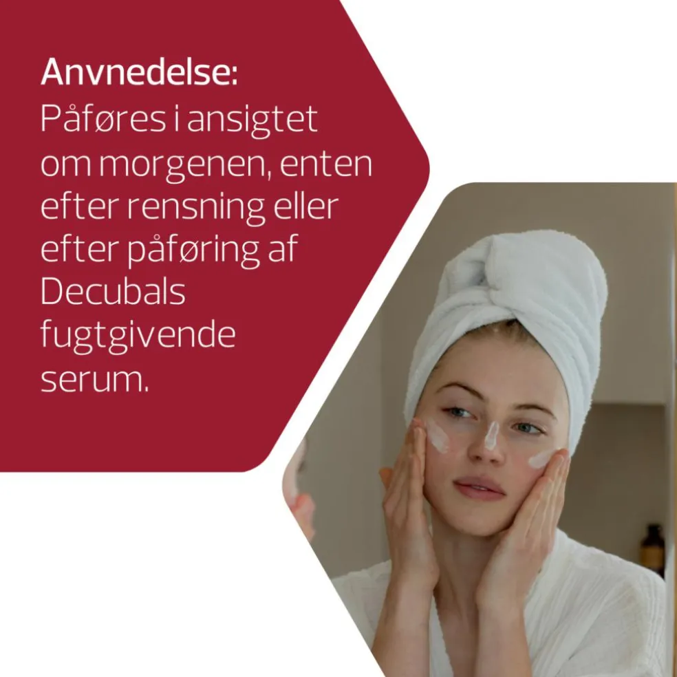 - Påfør om morgenen i både ansigtet og på halsen, enten direkte på ren hud eller efter serum.