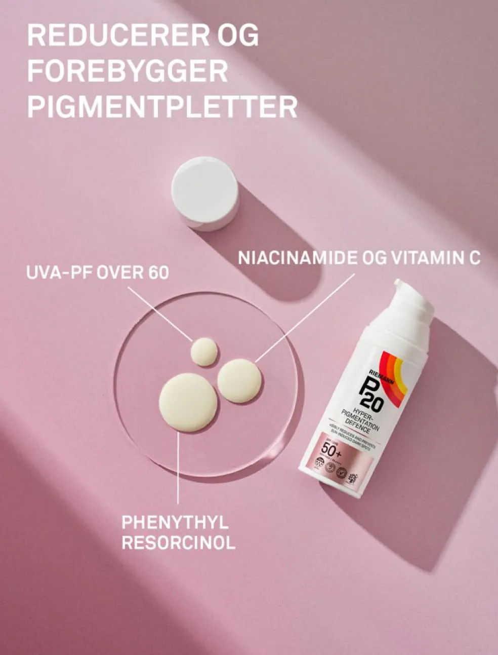 Solcremen indeholder en unik høj UVA-beskyttelse, der er med til at forhindre forekomsten af hyperpigmentering i huden. Herudover indeholder solcremen Vitamin C og E og Phenylethyl Resorcinol, der er med til at minimere produktionen af melanin i huden. Niacinamid hæmmer overførslen af melanin til de øverste lag af huden.