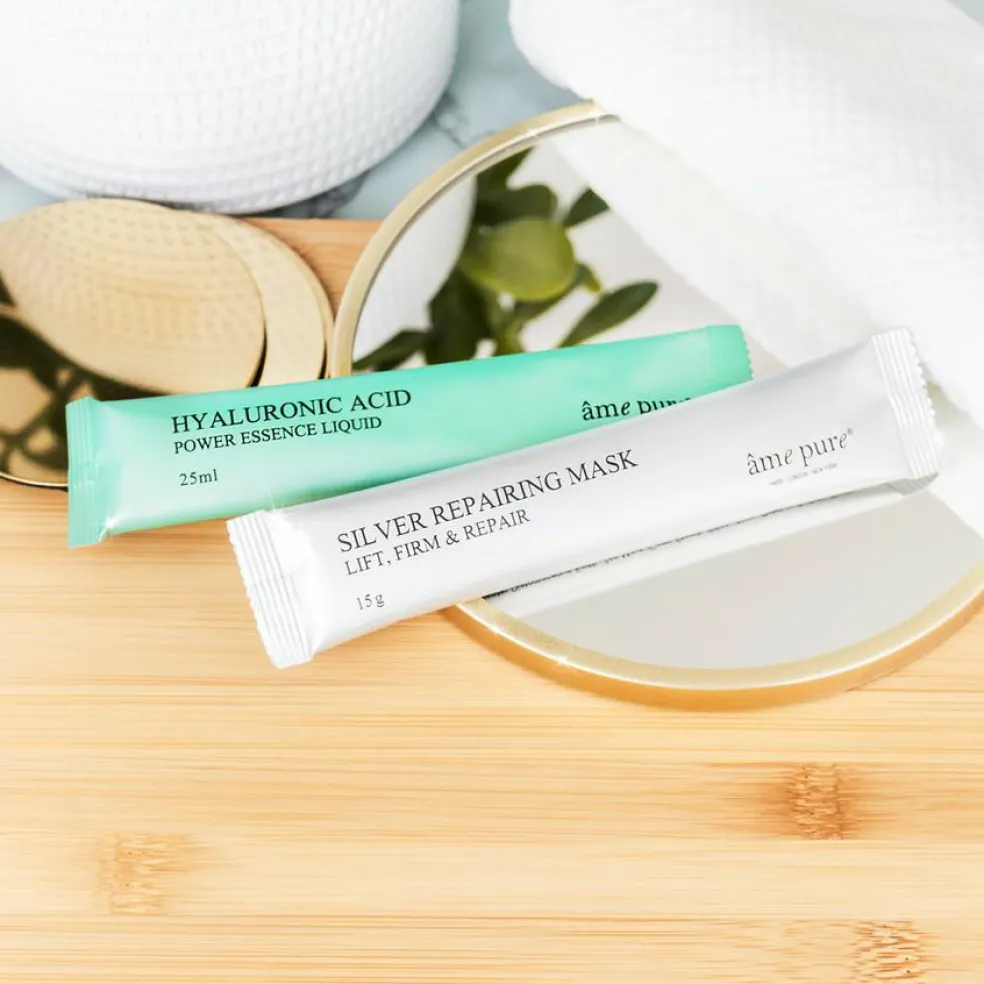 Dette er én maske hvor Silver Reparing Mask (sølv 15 g) skal blandes sammen med flydende hyaluronsyre (grøn 15 g), så det danner en dejlig konsistens – følg anvendelsesvejledningen.