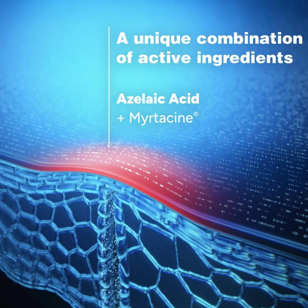8% antioxidant azelainsyre og 3% eksfolierende glykolsyre hjælper med at reducere intensiteten af røde og brune mærker efter bumser.