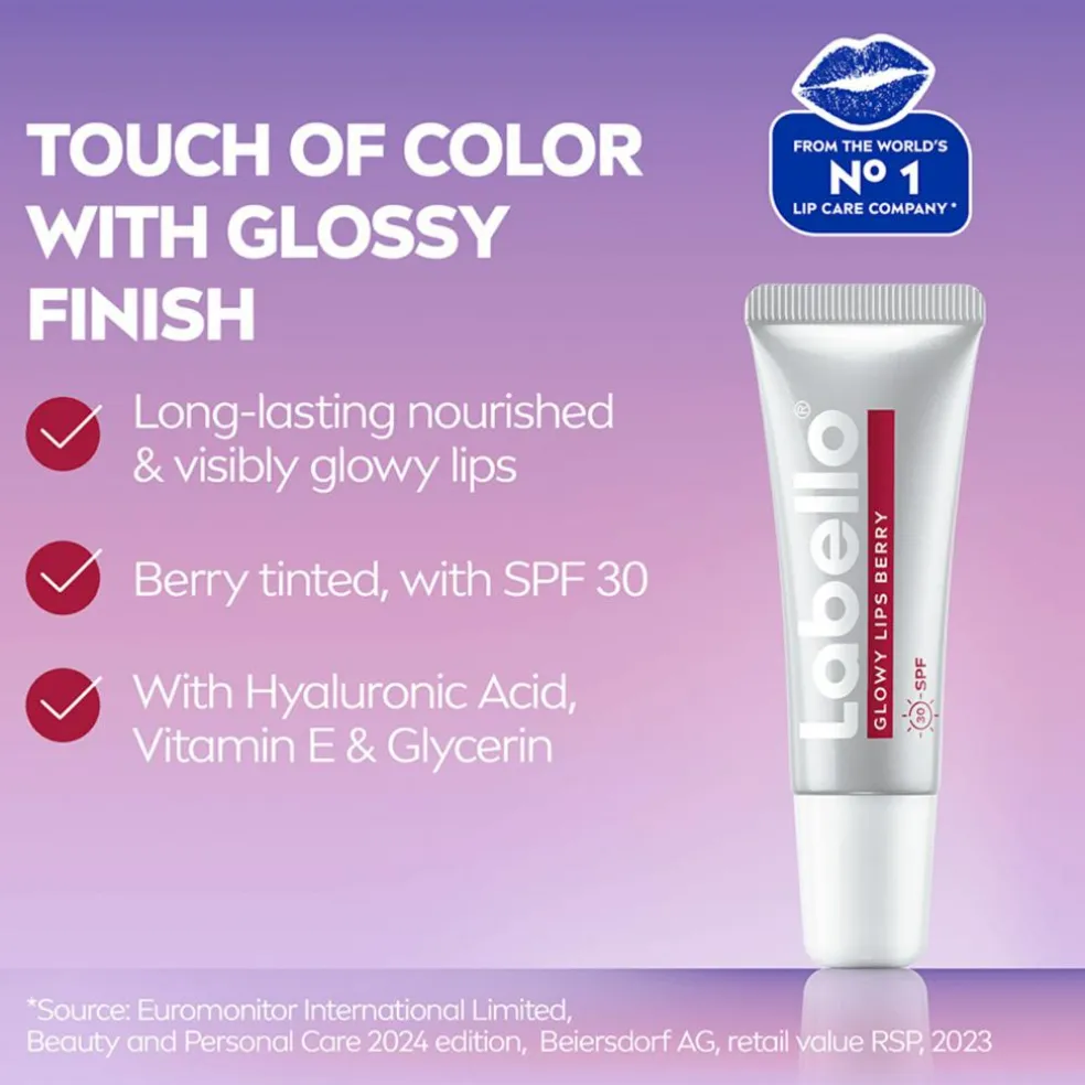 GLOWY LIPS giver dine læber et strejf af farve og en flot glansfuld finish. Denne læbepomade er tilsat vores ultrahydratiserende formular med hyaluronsyre, E-vitamin og glycerin og genopliver din egen naturlige hudglød. Labello® er skånsom mod al læbehud og tørrer ikke læberne ud.