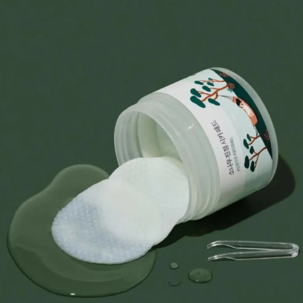 Beroligende pads med cica og fyrreekstrakt, der reducerer rødme og fugter huden.