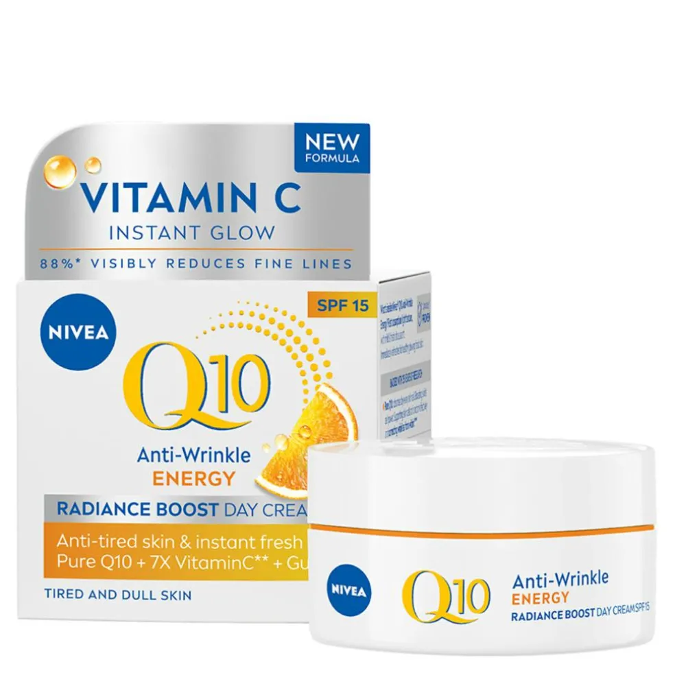 NIVEA Q10 Energy Healthy Glow Day Cream er en dagcreme med en let og forfriskende formel, som hurtigt absorberes af huden og giver en sund glød. Med en mild og frisk citrusduft. Beriget med ren Q10, C-vitamin og guarana-ekstrakt. Q10 øger hudcellernes styrke og hjælper dem med at fungere effektivt samt korrigerer rynker indefra (testet på hudceller). 7X C-vitamin (sammenlignet med en citron): kraftig koncentration for en glat og strålende hud. Guarana-ekstrakt er kendt for at være forfriskende og energigivende. Denne dagcreme indeholder også SPF15, som beskytter huden mod UVA/UVB-stråler, der forårsager for tidlig ældning af huden. 24 timer: opfrisker og giver huden ny energi med det samme for 92 % af kvinder (selvevaluering, 110 kvinder, 2022). Sund glød hele dagen. 2 uger: reducerer synligt træthed i huden for 95 % (selvevaluering, 110 kvinder, 2022). Fastere og mere strålende hud. 4 uger: reducerer synligt fine linjer, hjælper med at modvirke de første tegn på ældning for 91 % (selvevaluering, 110 kvinder, 2022). 88 % af kvinderne bekræfter, at dagcremen synligt reducerer fine linjer (selvevaluering, 2-ugers studie, 110 kvinder, 2022). Denne dagcreme er dermatologisk testet og velegnet til mat og træt hud.
