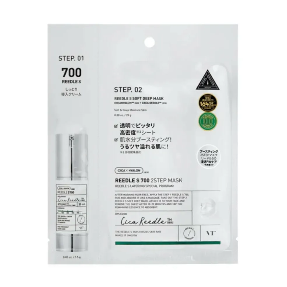 Den todelte pakke indeholder en pose Reedle Shot 700 essens og en sheet mask.