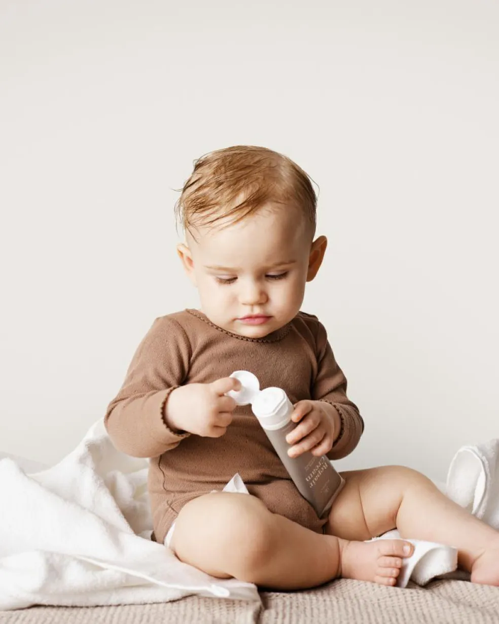 Den indeholder økologiske ekstrakter af morgenfrue og kamille og virker helende og beroligende på skadet hud.