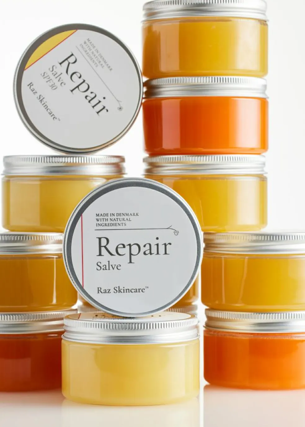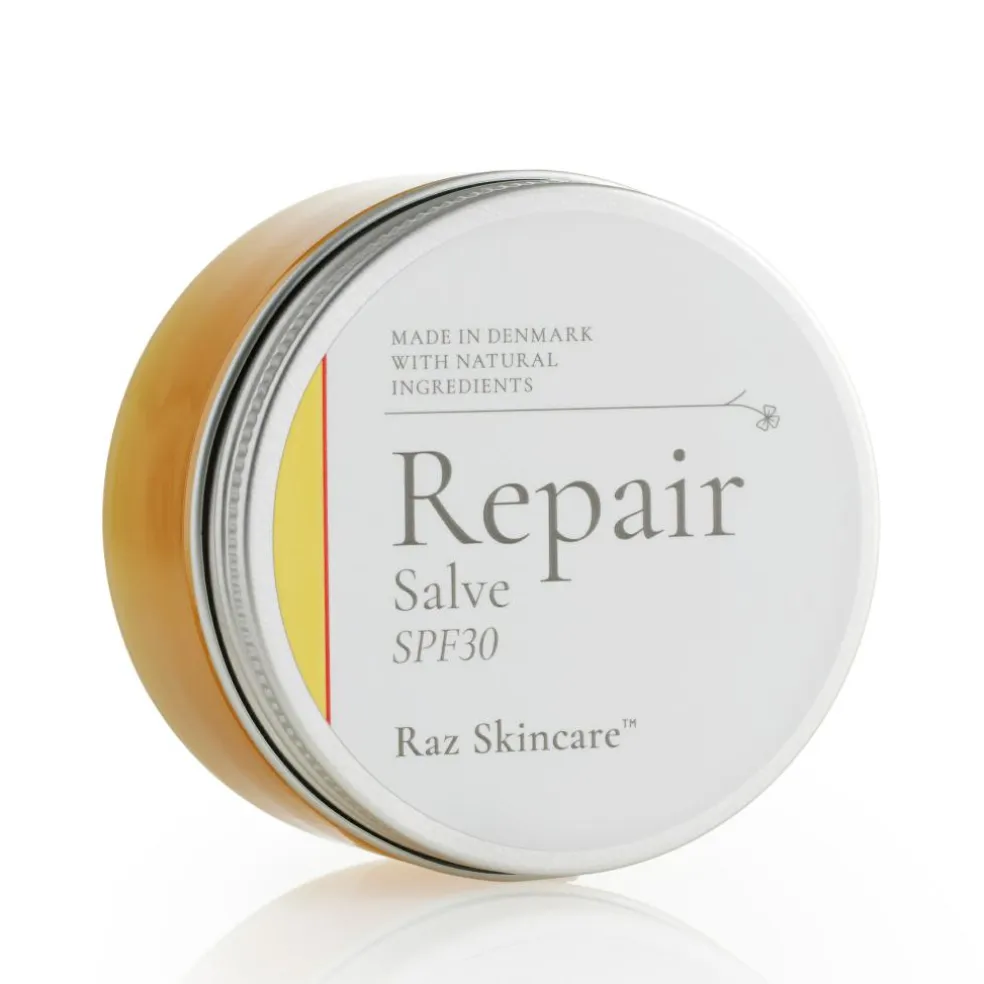 Repair Salve, SPF30, fra Raz Skincare kombinerer alt det bedste fra den originale salve med effektiv solbeskyttelse. Denne multifunktionelle salve beskytter huden mod solens skadelige stråler og er perfekt til brug på læber, kinder og næse – især på skiferien, hvor solen og sneen kan være ekstra hård mod huden.