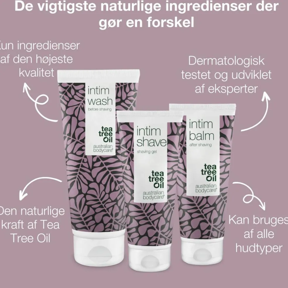 Pakken til intimbarbering indeholder Intim Wash, Intim Shave og Intim Balm med Tea Tree Oil, der effektivt modvirker bakterier og sikrer en pæn intim barbering fri for røde knopper, skægpest og indgroede hår.