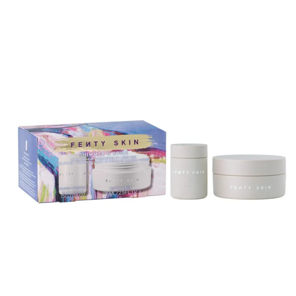 Limited Edition Shimmer N Spice Warm Cinnamon Lip + Body Duo. Tilfredsstil dine lyster med denne læbe- og kropsplejeduo i begrænset oplag med blødt guldglimmer og varm kanelduft. Tag Plush Puddin’ læbemaske på for at få en glattere, fastere og fyldigere trutmund. Dyp derefter i Butta Drop kropscreme for øjeblikkelig fugt og en blank finish.