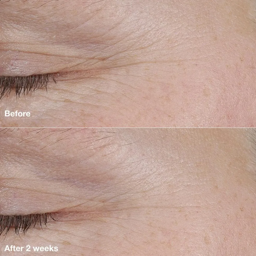 Klinisk bevist at den synligt reducerer 7 linjer på 14 dage*. Disse linjer inkluderer pandelinjer, bekymringsrynker (også kendt som 11-tallet mellem brynene), kragetær ved øjnene, linjer ved næsefolden, marionettelinjer og linjer rundt om læberne. *Klinisk testet på 36 kvinder efter brug af produktet i 2 uger.