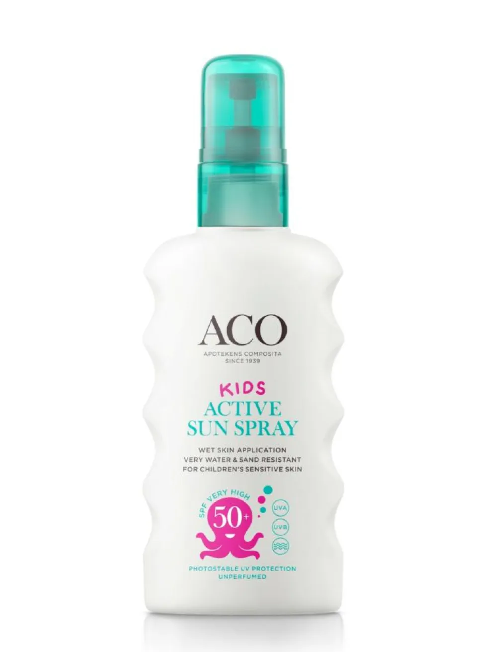 ACO Sun Kids Spray SPF 50+ absorberes hurtigt uden at være fedtet og kan påføres på våd og fugtig hud. Alle produkter fra ACO Kids Active er ekstra vand- og sandresistente.