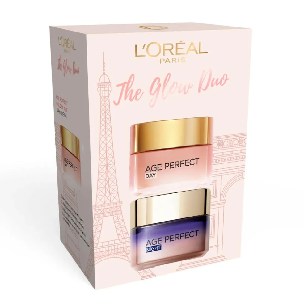 The Glow Duo fra L’Oréal Paris Age Perfect Rosy Glow er en gaveæske med dagcreme og natcreme til moden hud i behov af glød og næring.