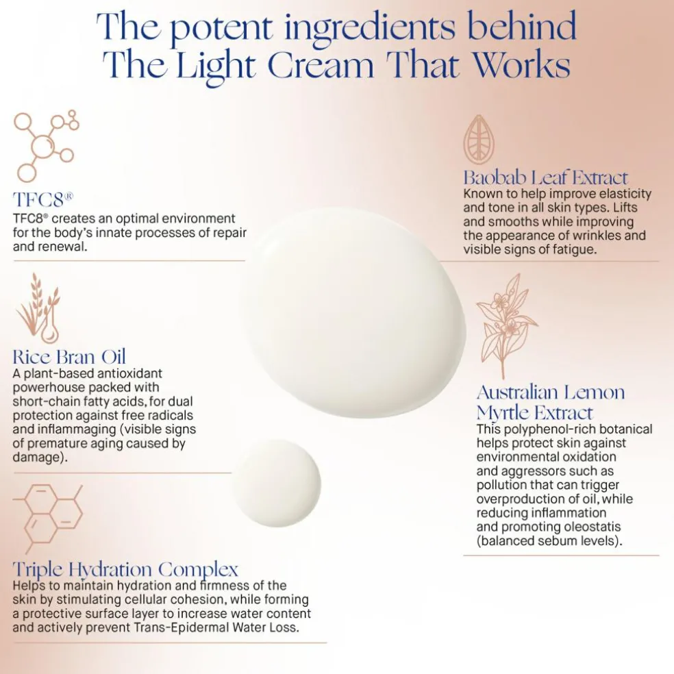 En videnskabeligt baseret blanding af rene superfugtgivere og kraftfulde planteekstrakter – risbrændolie, et tredobbelt fugtkompleks, baobabbladekstrakt og australsk citronmyrteekstrakt – bekæmper årsagerne til overaktiv talgproduktion og giver samtidig antioxidantbeskyttelse mod forurening og andre miljømæssige faktorer, der kan forårsage uønsket glans. Formlen absorberes hurtigt af huden og giver en smukt afbalanceret glød, der er fugtet, frisk og strålende.