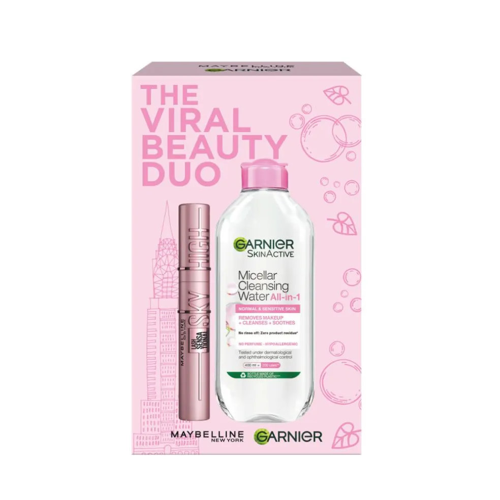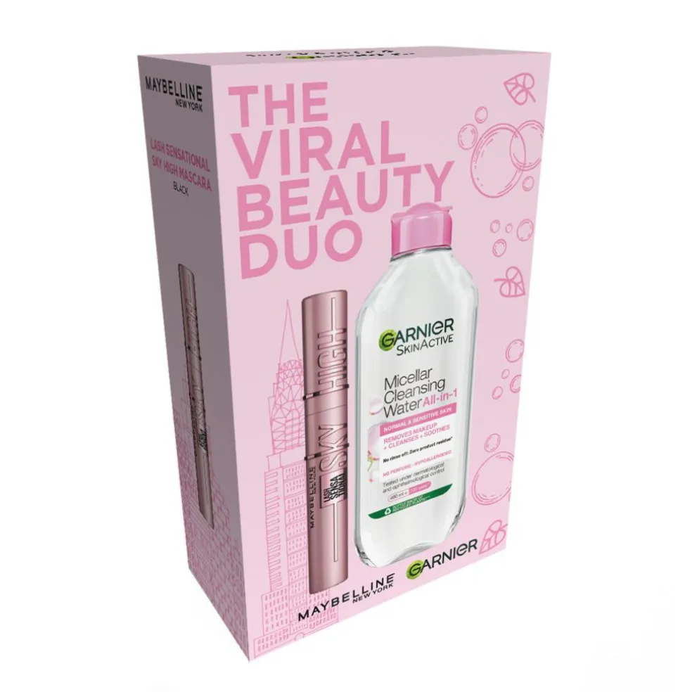Garnier The Viral Beauty Duo Gift Box indeholder den populære Maybelline Lash Sensational Sky High Mascara Black + Garnier Micellar Cleansing Water for Sensitive Skin. Mascaraens unikke formel løfter vipperne uendelig højt – når det er tid til at lande så brug micellærvandet til skånsomt at rense og fjerne makeup samt give huden en ren og frisk følelse.