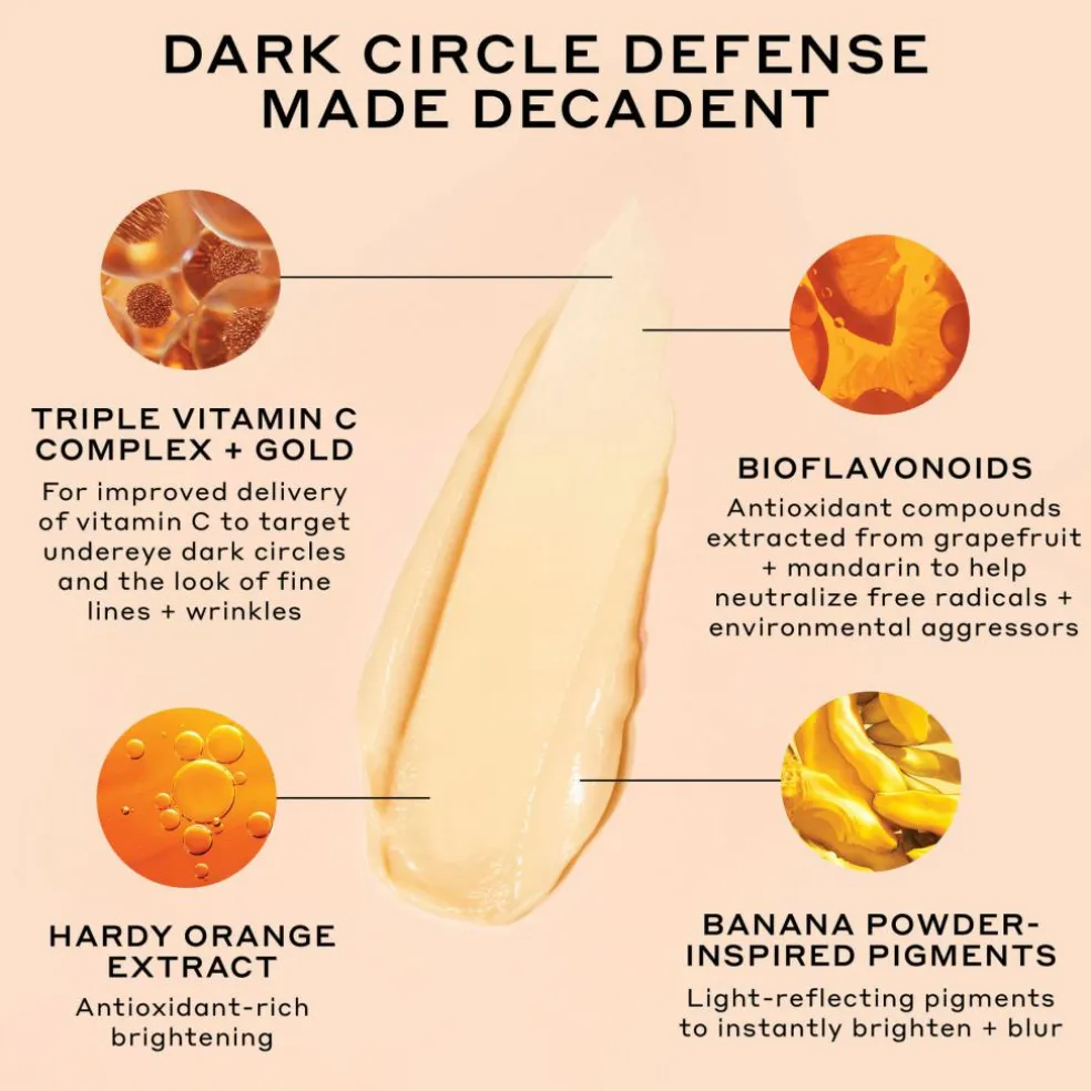 Denne ultracremede, duftfri øjencreme er klinisk formuleret med et tredobbelt C-vitamin-kompleks indkapslet i ægte guld for forbedret levering, der synligt forbedrer mørke rande og genstridige kragetæer over tid. Den er superladet med antioxidantrig hardy orange-ekstrakt og lysreflekterende pigmenter inspireret af banana powder for øjeblikkelig fugt og glød. Den crease-resistente, farvekorrigerende formel kan bruges alene eller under concealer.