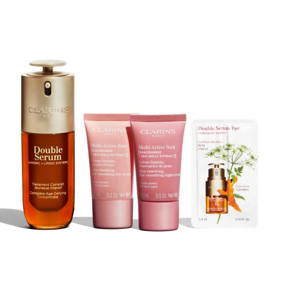Til ansigtet er der den ikoniske Double Serum, der er formuleret med 27 planteekstrakter, som er målrettet mod tegn på aldring. Den bruges sammen med Multi-Active dag & nat creme med tidsel ekstrakt, som hjælper med synligt at reducere de første tegn på aldring, og denne duo fugter huden, mens den bevarer sit ungdommelige udseende.