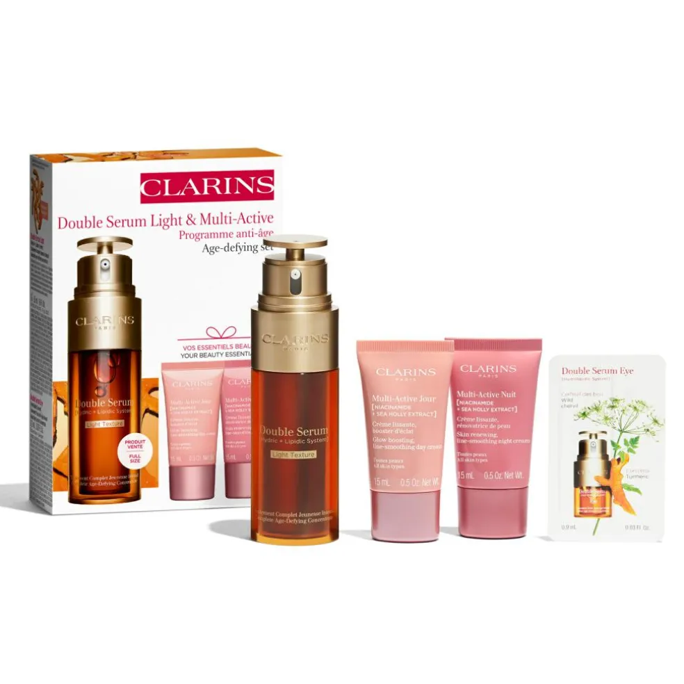 Double Serum Light Texture retter sig mod de synlige tegn på aldring takket være den unikke dobbelte formel, der er rig på 21 af de mest kraftfulde planteekstrakter, mens Double Serum Eye retter sig mod øjenområdet.