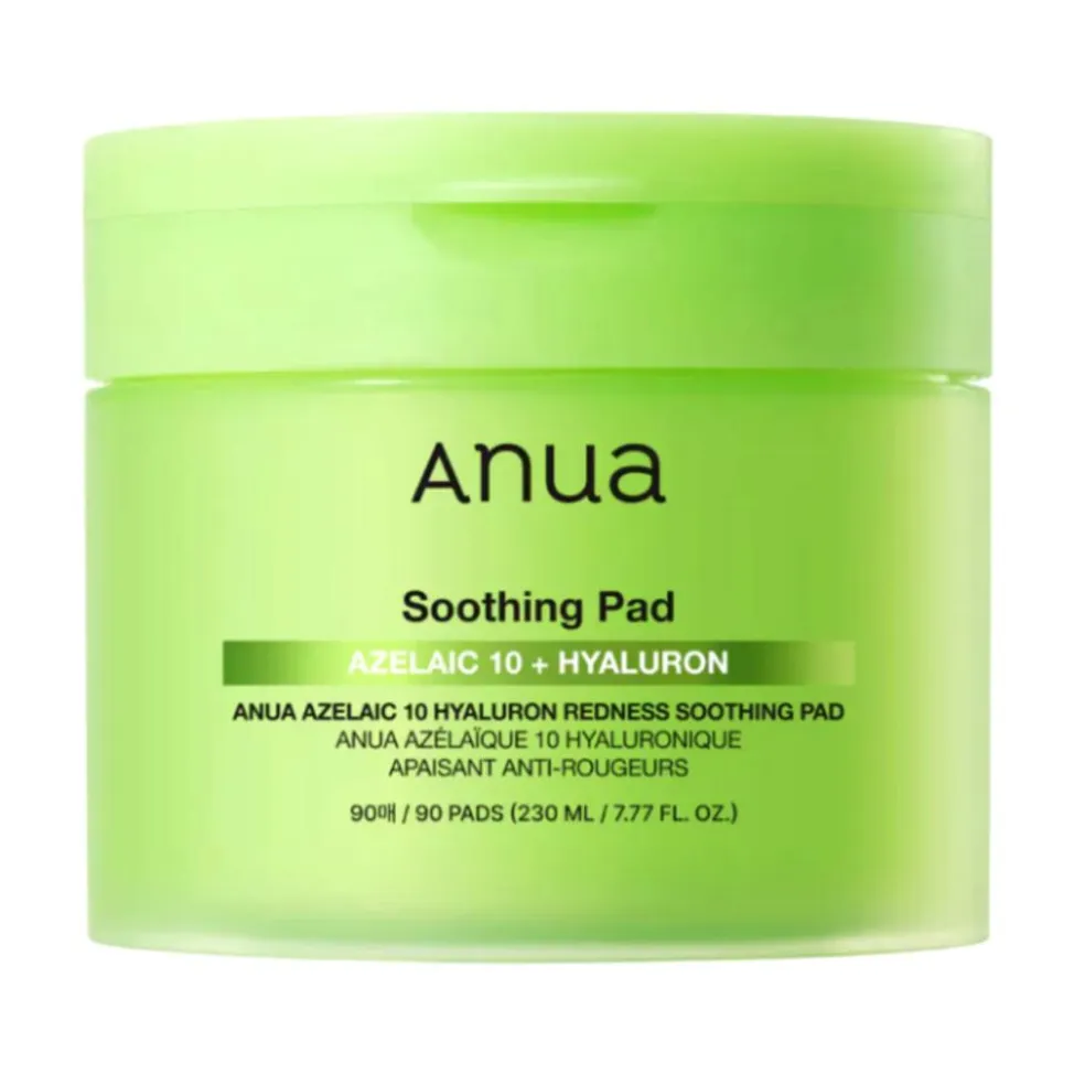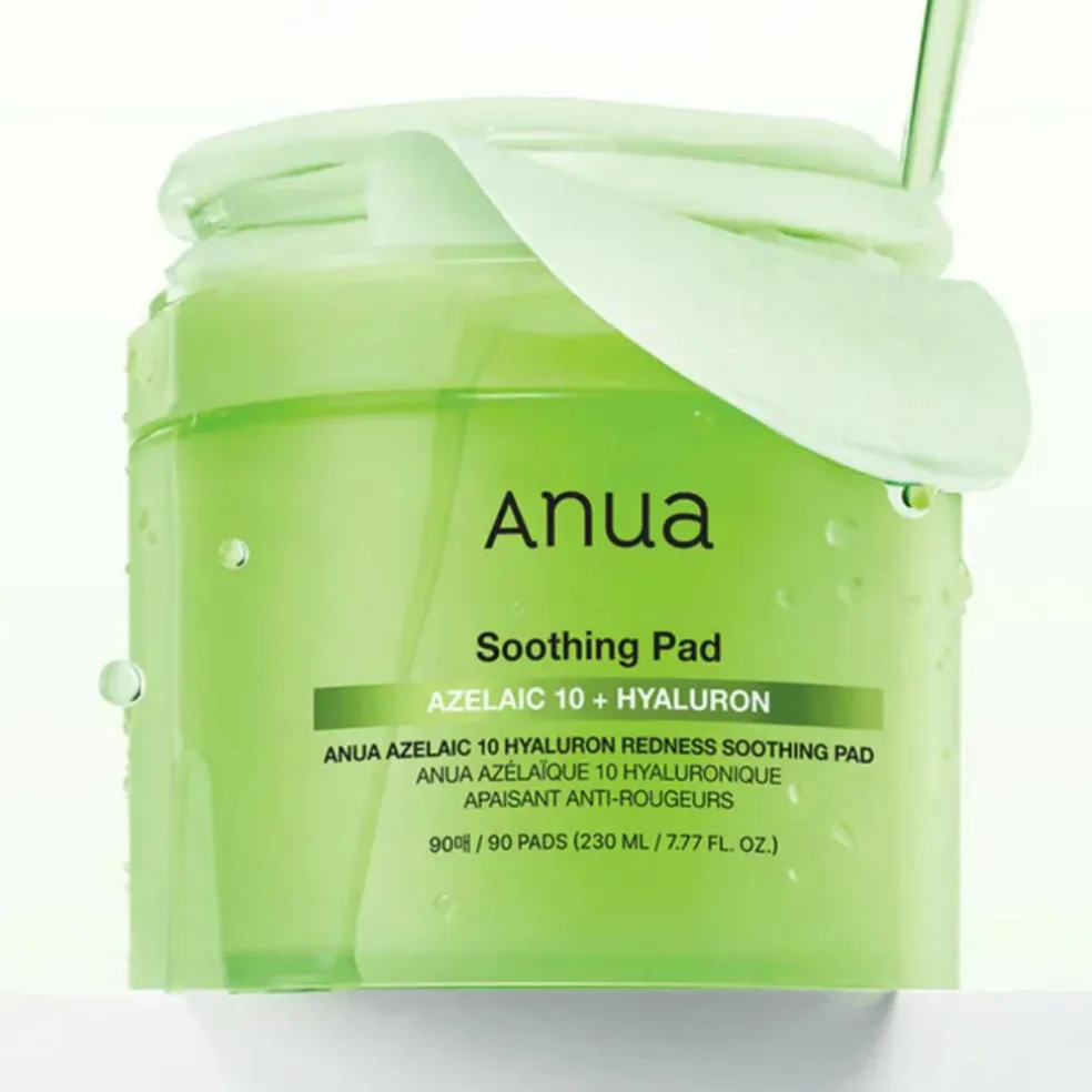Beroligende pads med azelainsyre og hyaluronsyre, der reducerer rødme og tilfører intensiv fugt for en mere jævn hudtone.